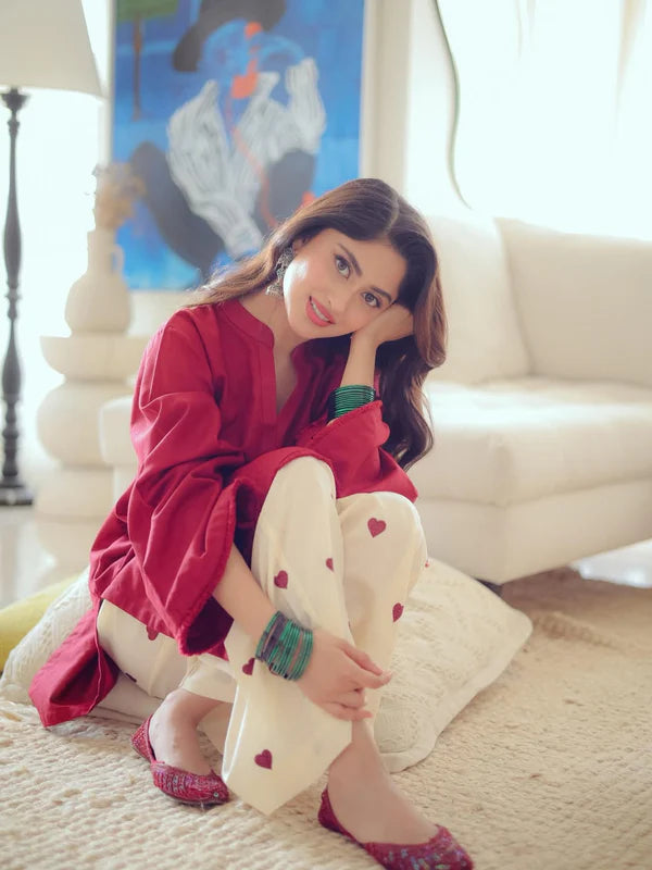 Hearts Red (Stitched 2 Pcs) Premium Stone Linen